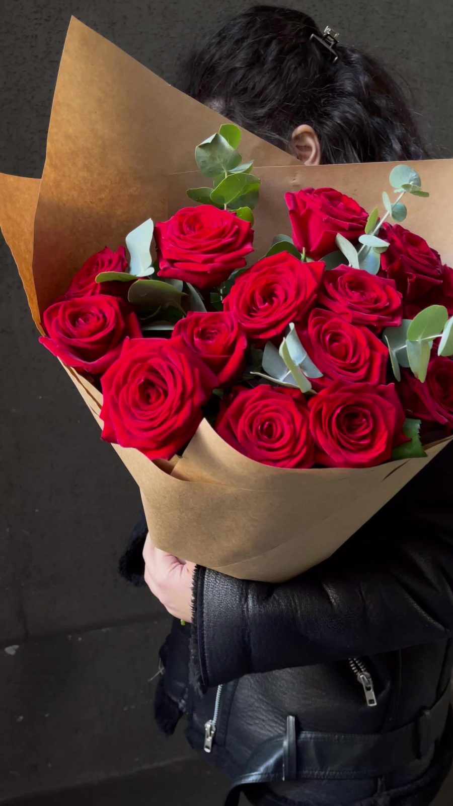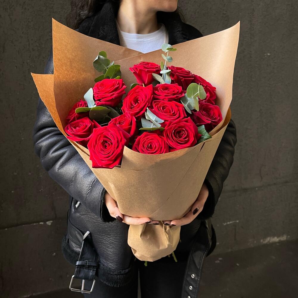 Эвкалипт – 3 шт.Упаковка дизайнерская – 2 шт.Роза красная 50 см – 15 шт.