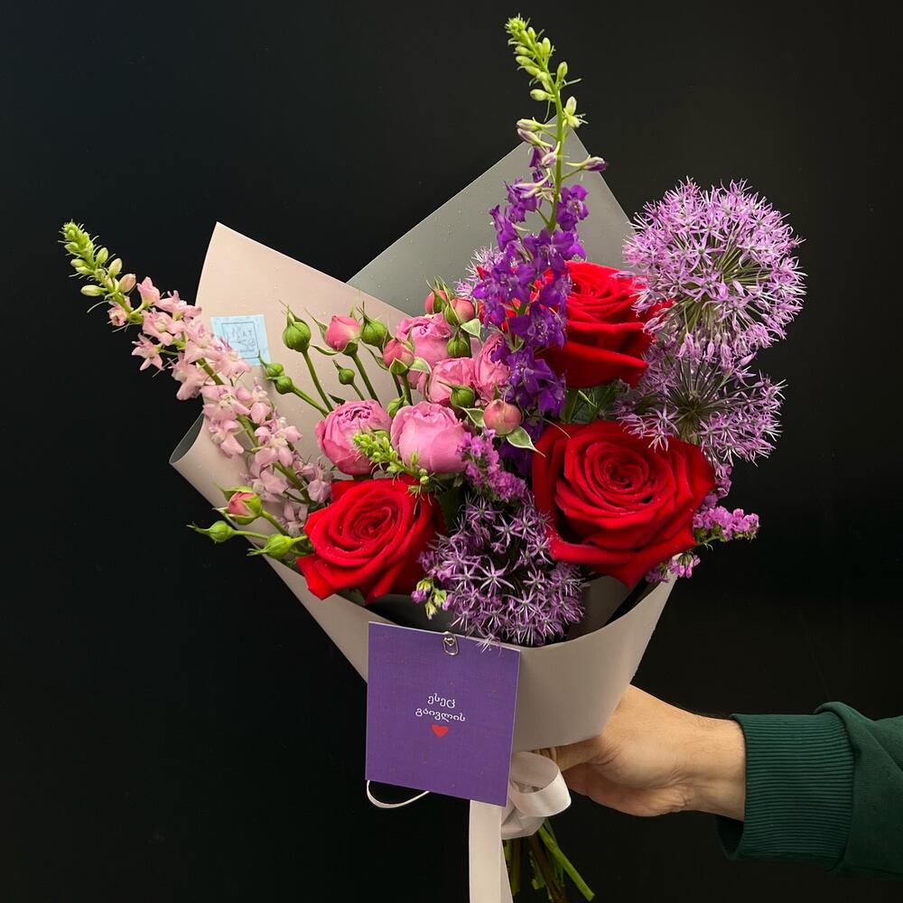 Роза Эквадор – 3 шт. Луковичные растения – 3 шт. Пионовидная кустовая роза – 1 шт. Лимониум – 2 шт. Упаковка дизайнерская – 2 шт. Открыточка с вашими пожеланиями – 1 шт. инструкция по уходу за цветами – 1 шт.