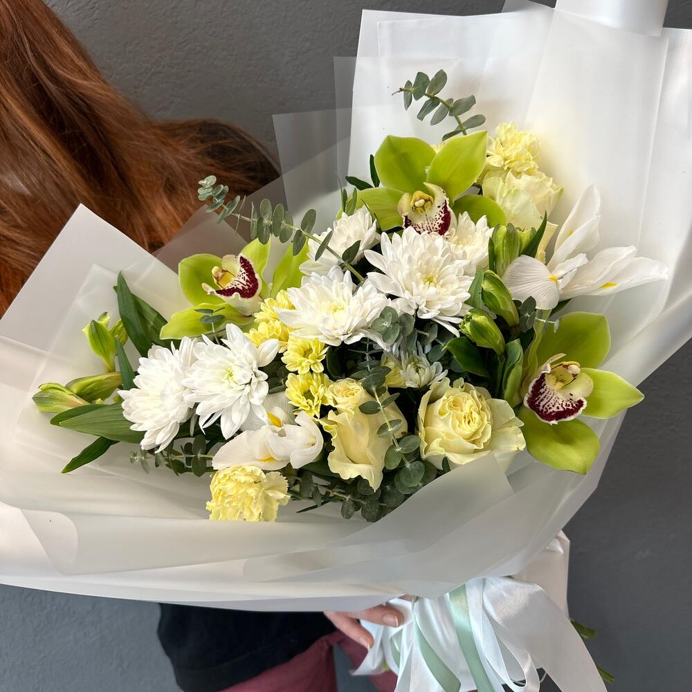 Альстромерия – 3 шт.Хризантема кустовая – 2 шт.Эвкалипт – 3 шт.Роза – 3 шт.Лента атласная – 2 шт.Фисташка – 1 шт.орхидея – 2 шт.Упаковка дизайнерская – 2 шт.Диантус кустовой – 2 шт.саньини – 1 шт.