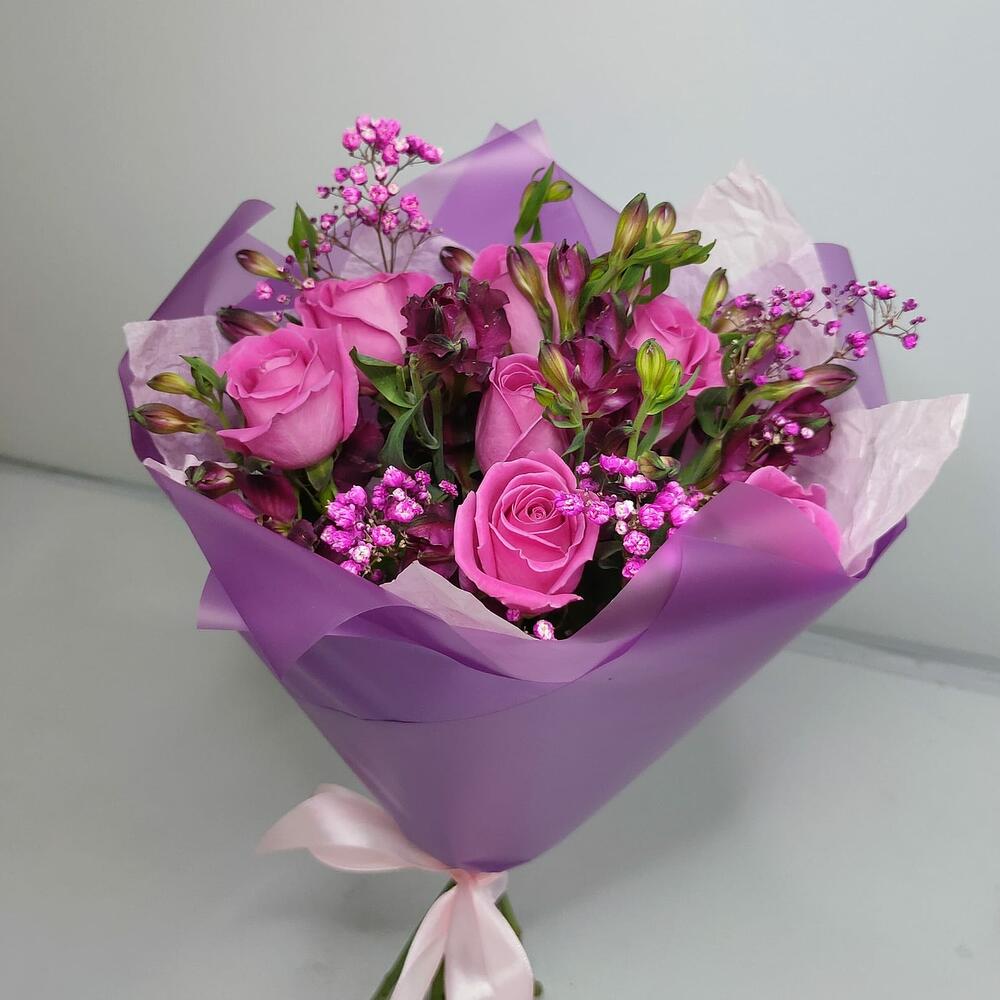 роза кения 40 см – 7 шт.Альстромерия лиловая – 2 шт.Гипсофила розовая – 1 шт.Дизайнерская упаковка – 1 шт.