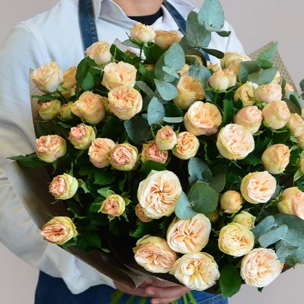 Букет из бежевых пионовидных роз и эвкалипта