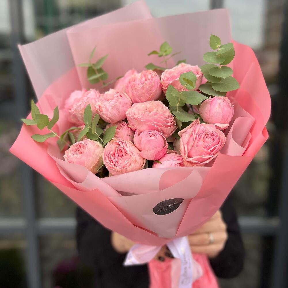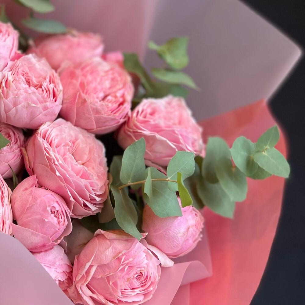 Букет из кустовой пионовидной розы и эвкалипт