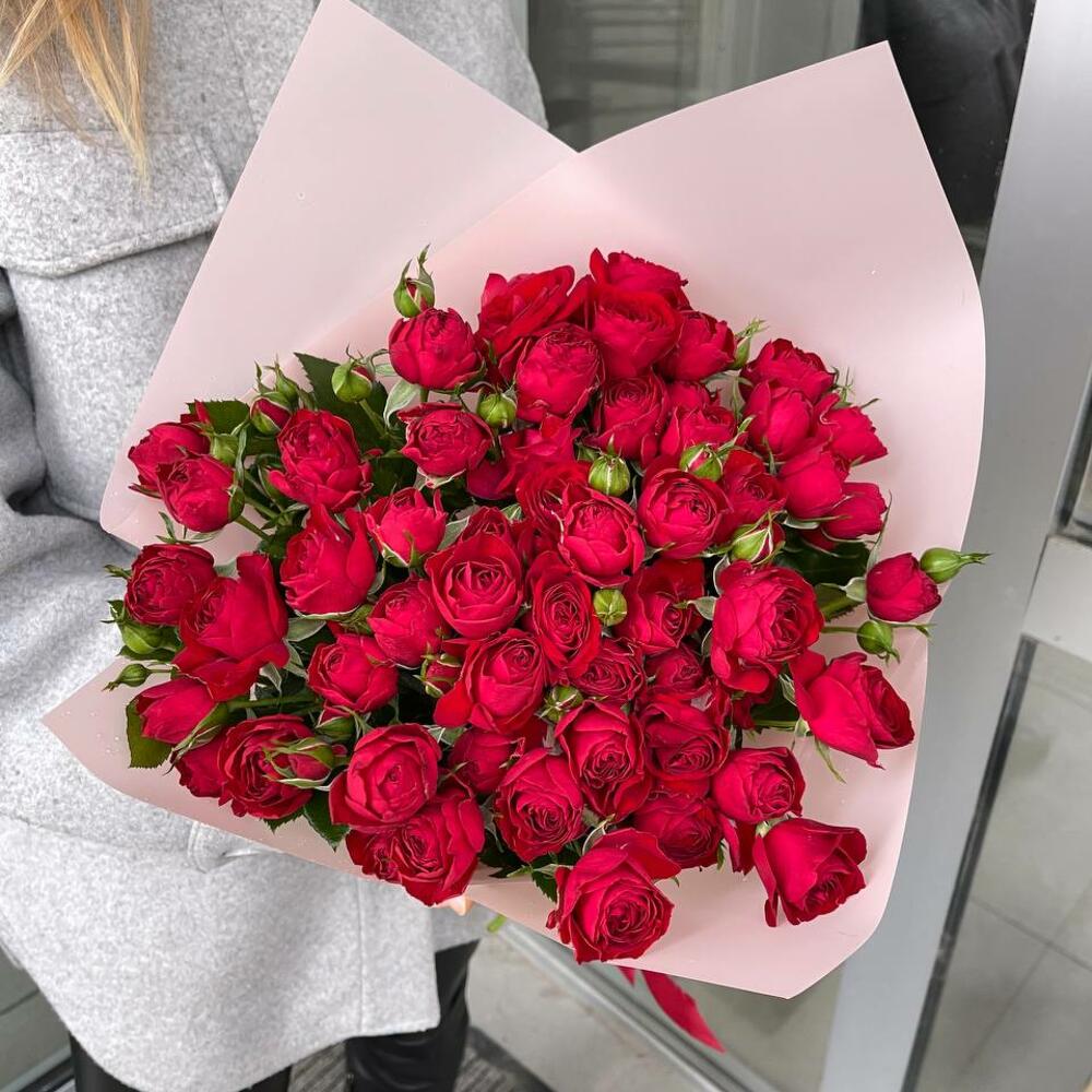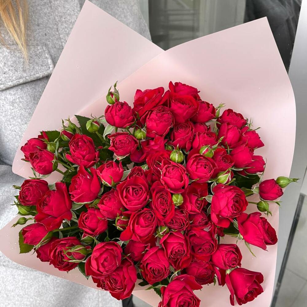 Упаковка – 1 шт. Атласная лента – 1 шт. красная веточная роза (веток) – 9 шт.