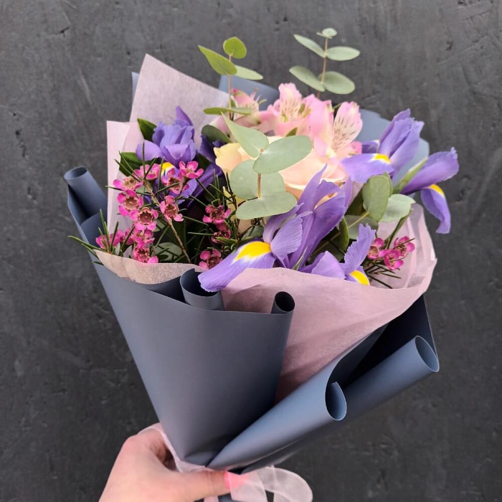 Букет-комплимент с ирисами, розой, альстромерией, ваксфлауэром( вереском) с эвкалиптом