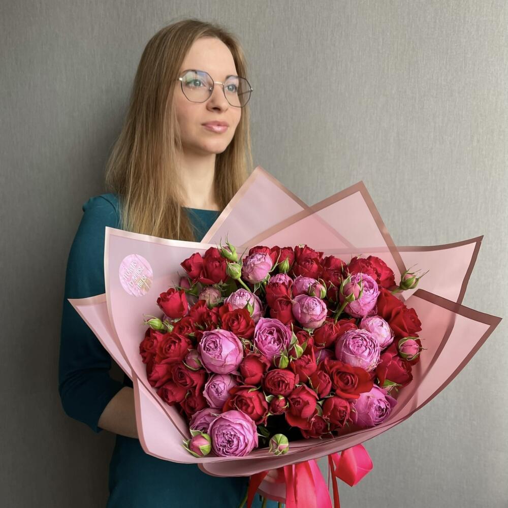 Кустовая роза – 10 шт. Упаковка – 1 шт. Атласная лента – 1 шт.