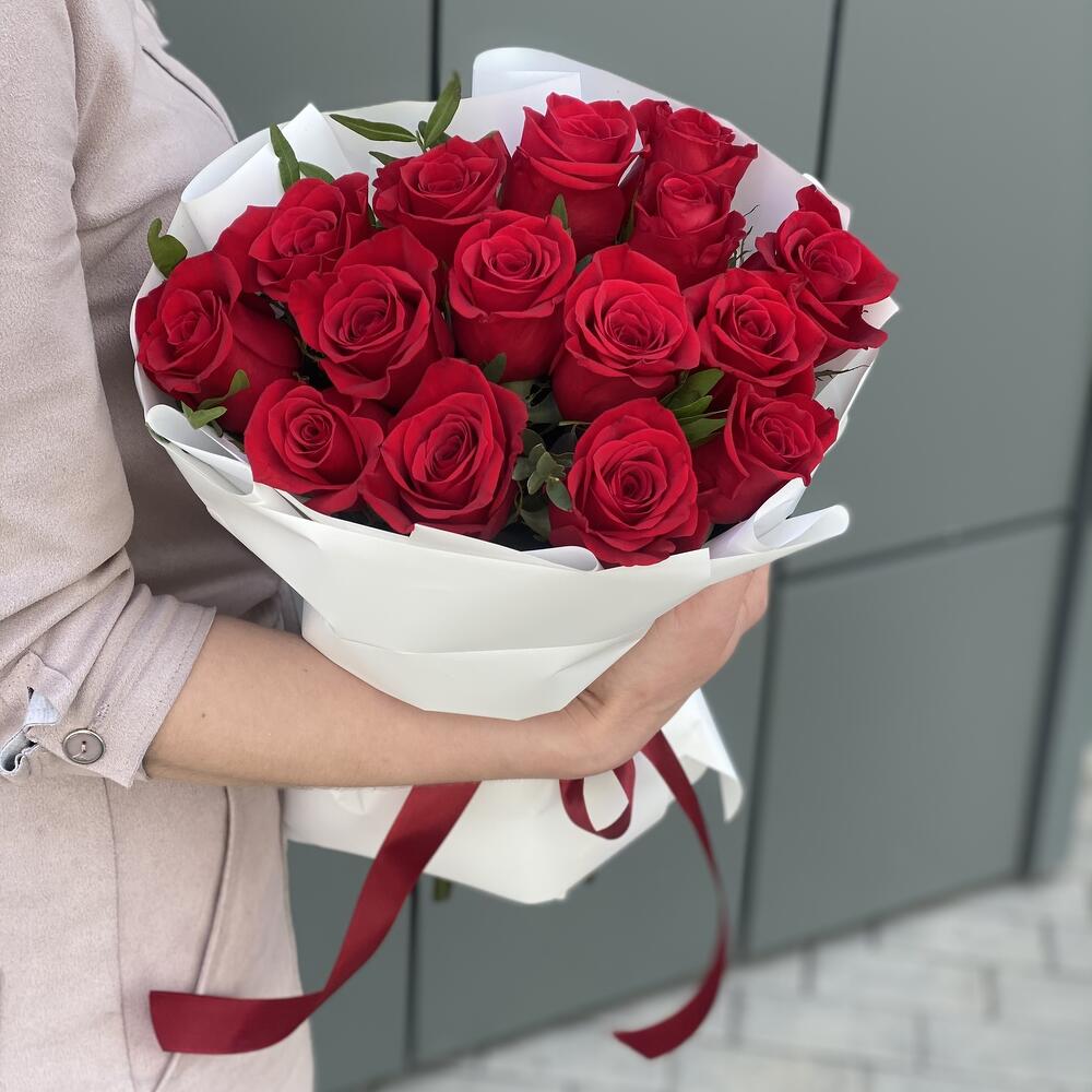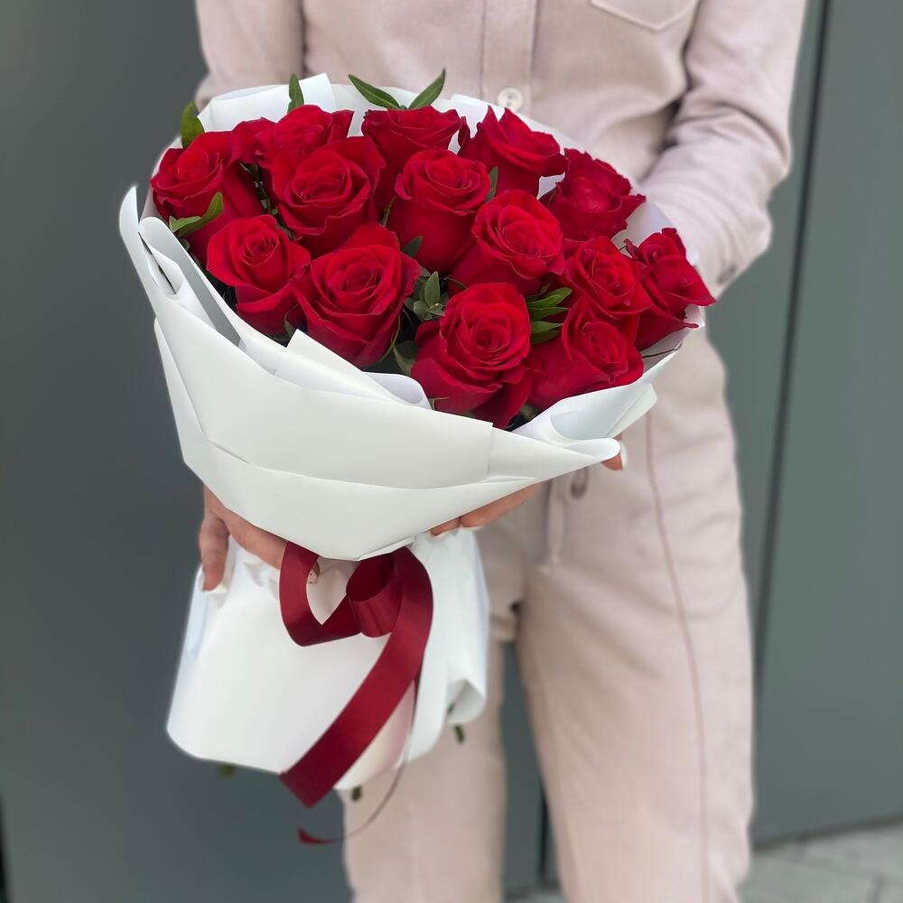 Роза Freedom – 15 шт. Эвкалипт парфиволия – 2 шт. Оформление – 1 шт.
