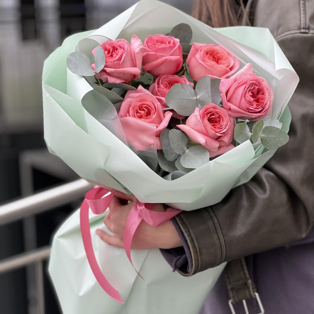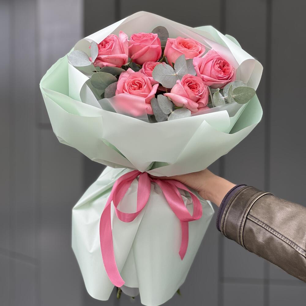 Эвкалипт – 2 шт. Оформление – 1 шт. роза пинк экспрешен – 7 шт.