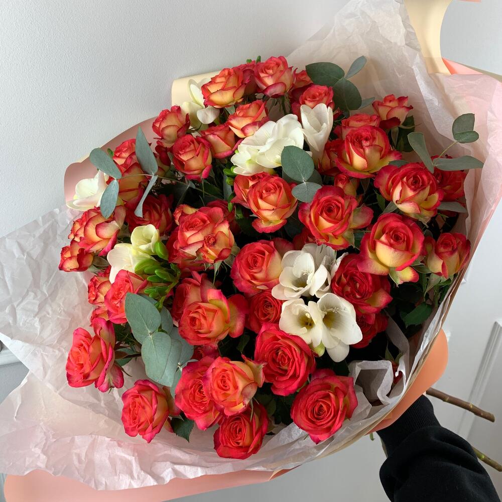 Букет «Плямя чувств» с кустовыми розами и фрезиями
