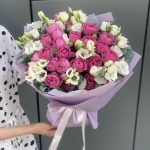 Эвкалипт – 2 шт. Оформление – 1 шт. эустома белая – 6 шт. кустовая пионовидная роза misty bubbles – 8 шт.