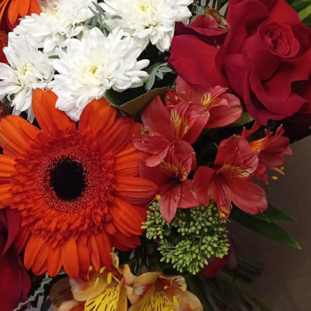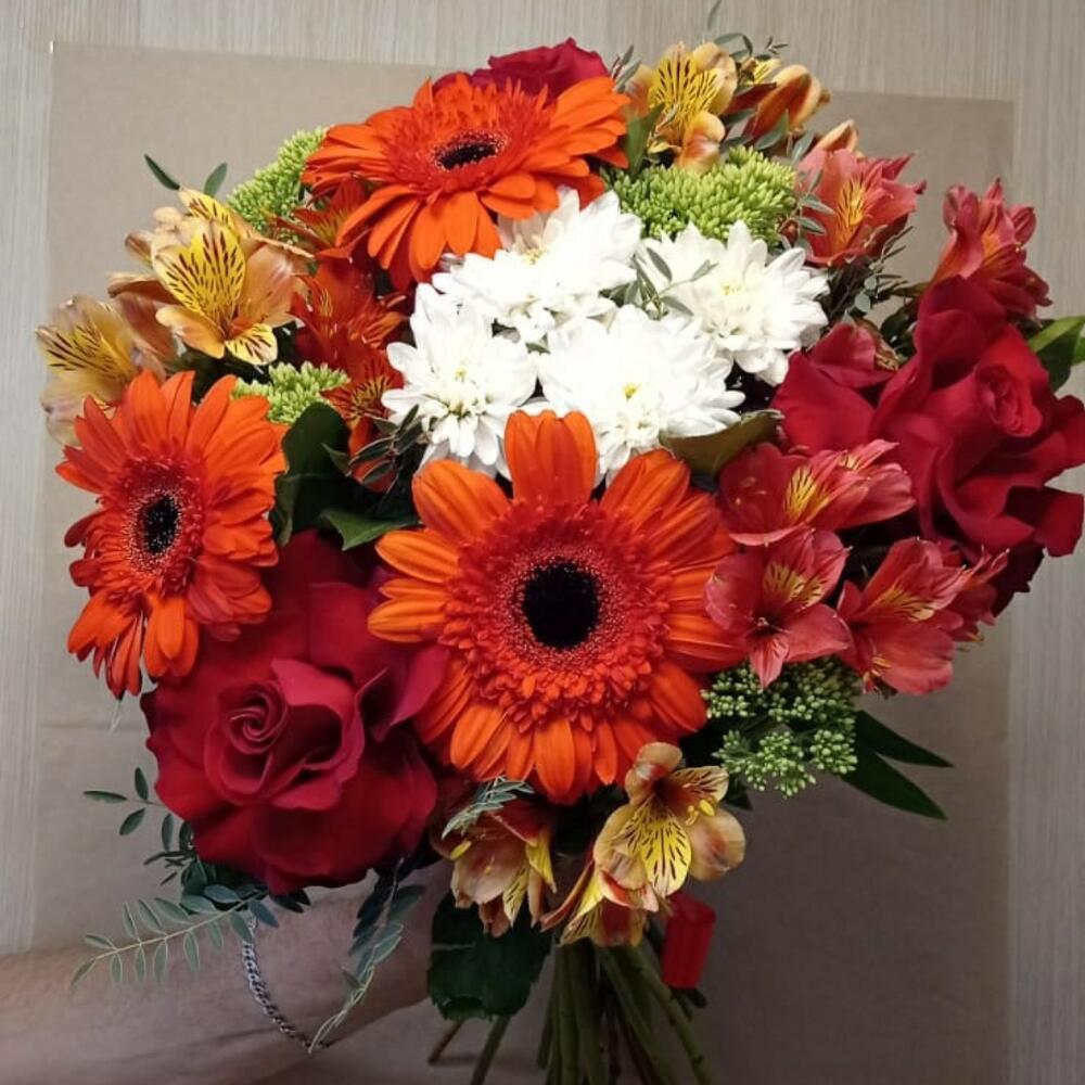 Альстромерия – 5 шт. Роза красная – 3 шт. Хризантема кустовая белая – 1 шт. Гербера красная – 3 шт.