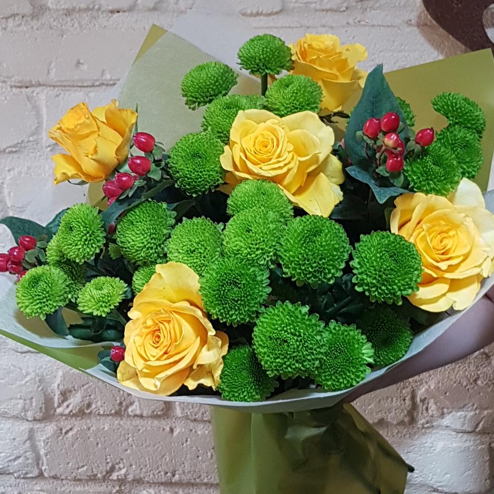 Букет в желто-зеленых тонах для тех, кто любит все естественное. Букет обернут натуральным крафтом в таких же тонах. Все вместо симфолизирует близость к природе. К подарку обычно прикладывается наша карточка с красиво напечатанным текстом вашего послания. К букетам обычно прилагается рекомендация по уходу и объяснением причин. При доставке температура в машине курьера контролируется нами в зависимости от сезона.