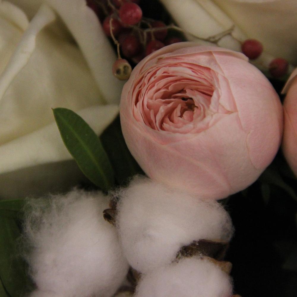 Роза пионовидная кустовая – 9 шт.Роза пионовидная – 7 шт.Лизиантус – 7 шт.хлопок коробка – 7 шт.Эвкалипт – 9 шт.Фисташка – 5 шт.Лента атласная – 2 шт.
