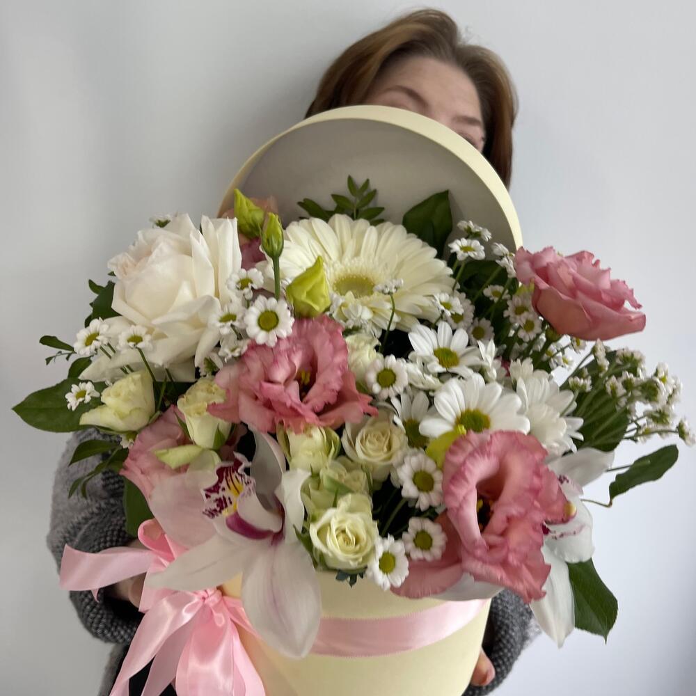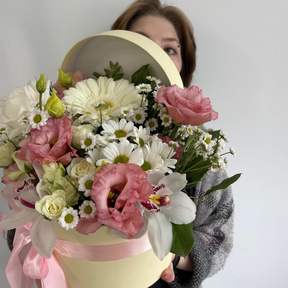 Гербера – 1 шт.Охара – 1 шт.Эустома – 1 шт.Сантини – 3 шт.Хризантема кустовая – 1 шт.Роза кустовая – 2 шт.Орхидея Цимбидиум – 1 шт.Коробка шляпная – 1 шт.Оазис флористический – 1 шт.Салал пучок – 1 шт.