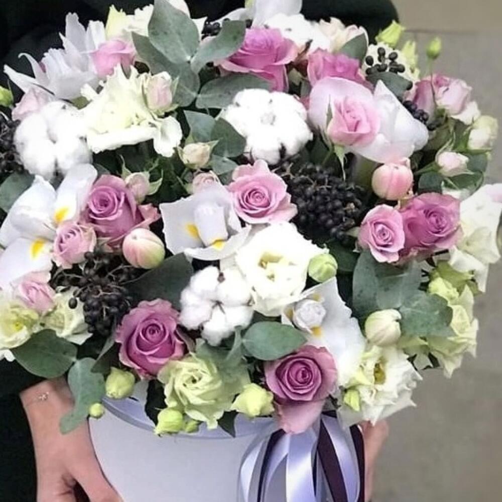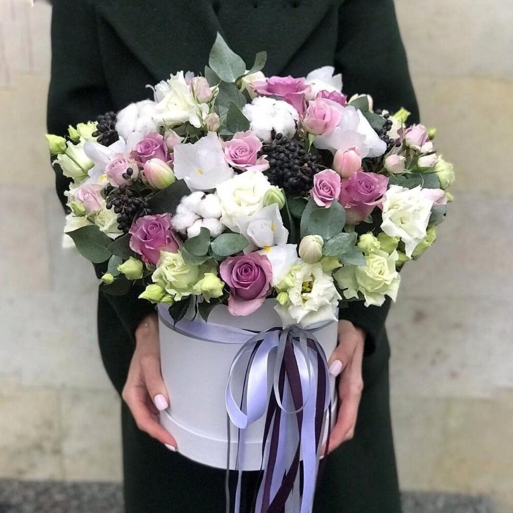 Коробка шляпная – 1 шт.Оазис флористический – 1 шт.Лента атласная – 3 шт.Эвкалипт – 6 шт.Роза – 7 шт.Роза кустовая – 3 шт.Хлопок натуральный – 5 шт.Ирис – 6 шт.Эустома – 3 шт.Ягоды вибурнум – 3 шт.Тюльпан – 9 шт.