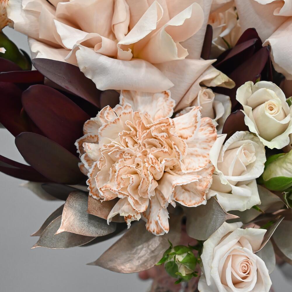 Элегантный свадебный букет в кремовой цветовой гамме. В составе французские розы, сортовая гвоздика, кустовая роза, экзотический леукадендрон и воздушная стифа.Флористы студии Цветочный Этикет собрали его из самых свежих цветов. Букет готов сиять красотой на всех фотография.