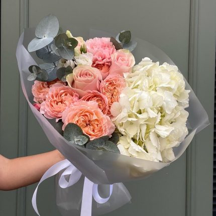 “Эвкалиптическая роскошь” гортензия и пионовидная кустовая роза