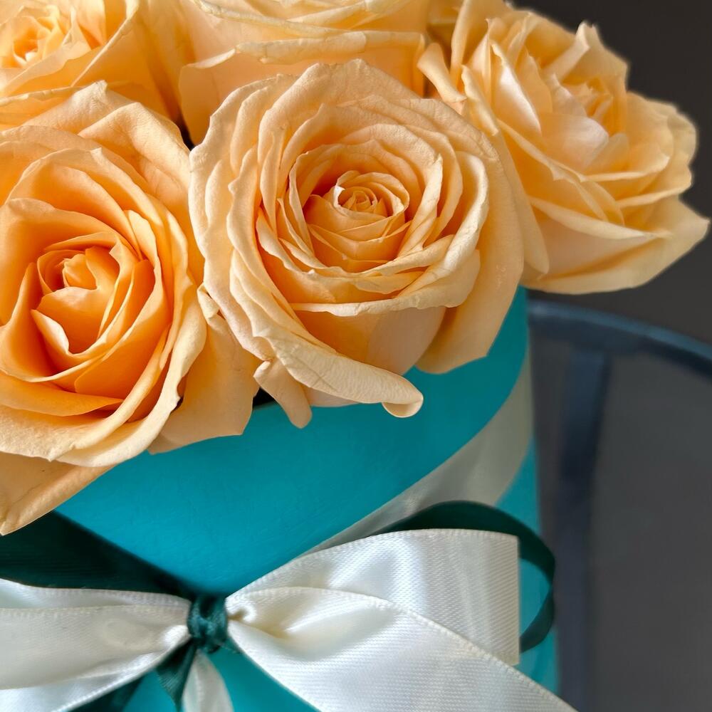 Композиция в коробке из 15 персиковых роз и ароматного эвкалипта