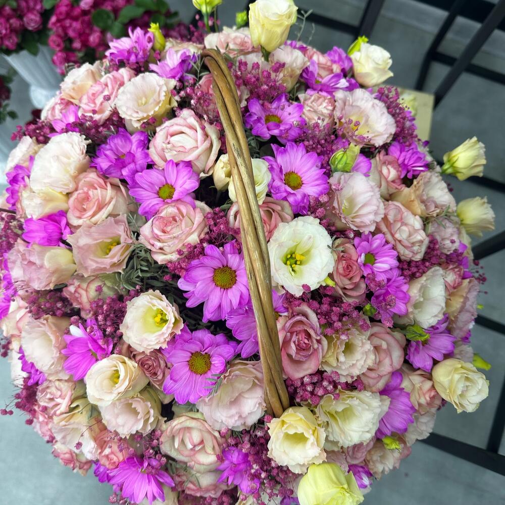 Роза – 29 шт. Хризантема – 33 шт. Эустома – 11 шт. зелень декоративная – 5 шт. Корзина плетеная – 1 шт.