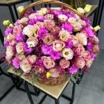 Роза – 29 шт. Хризантема – 33 шт. Эустома – 11 шт. Корзина плетеная – 1 шт. декоративная зелень – 5 шт.