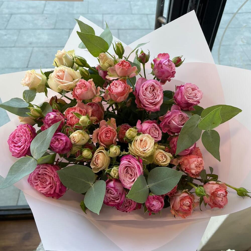 Пионовидная кустовая роза – 13 шт. Упаковка дизайнерская – 2 шт. Открыточка с вашими пожеланиями – 1 шт. инструкция по уходу за цветами – 1 шт.
