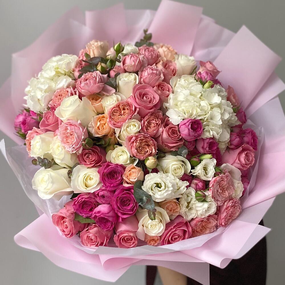 Букет из орхидей, хризантем, гортензий, белых роз и гипсофил