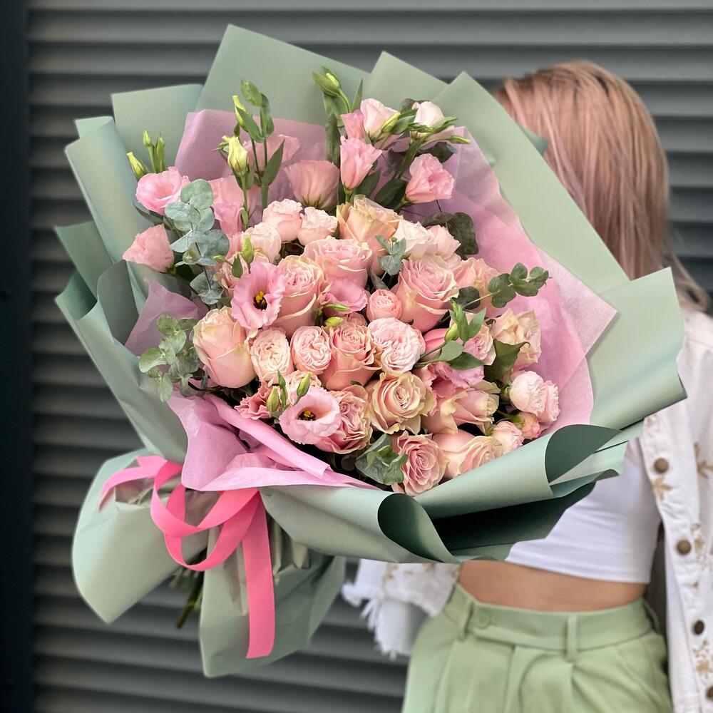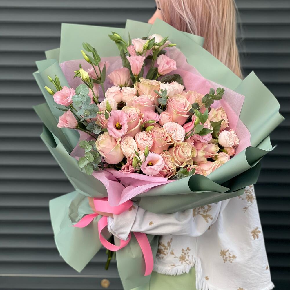 Альстромерии, Гвоздики, Кустовые розы, Лизиантусы, Розы, Хризантемы