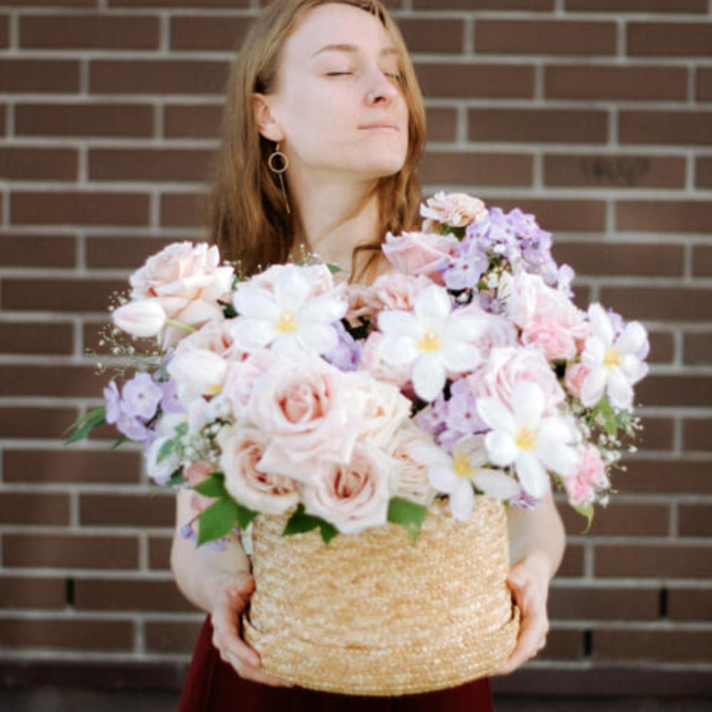 тюльпаны – 5 шт.розы – 14 шт.Диантус – 8 шт.Гипсофила – 3 шт.Флокс – 5 шт.Кустовая роза – 3 шт.шляпная корзина – 1 шт.
