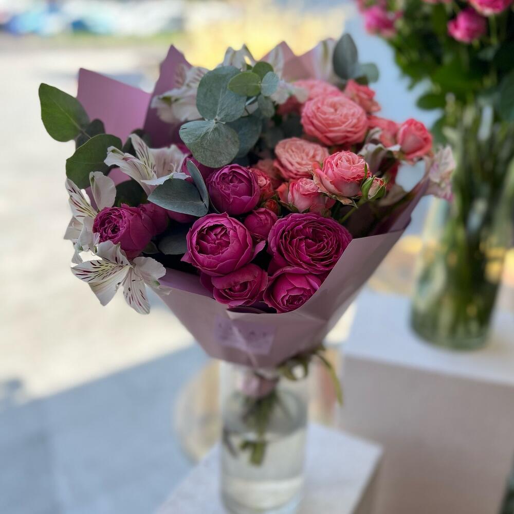 Спрей роза – 9 шт. Альстромерия – 5 шт. Упаковка дизайнерская – 1 шт. Открыточка с вашими пожеланиями – 1 шт.