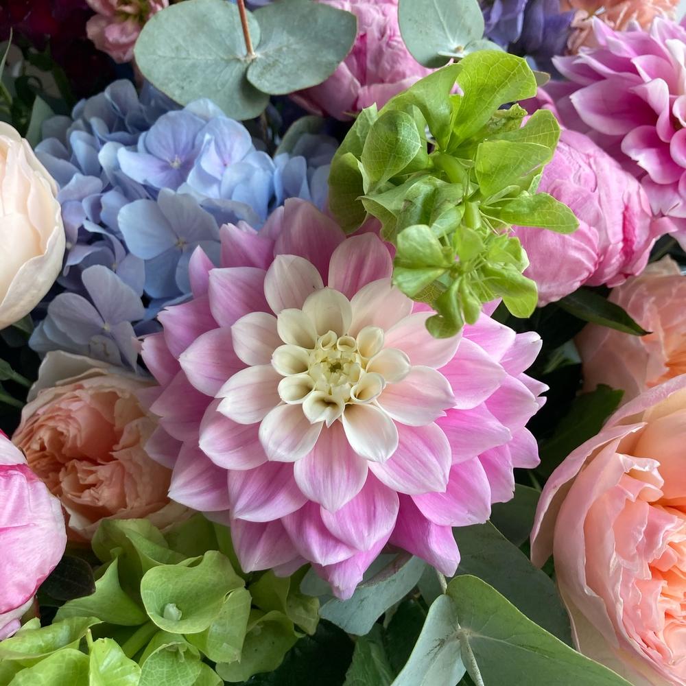 Тени в саду - Корзина с пионовидными розами, георгинами и дельфиниумом