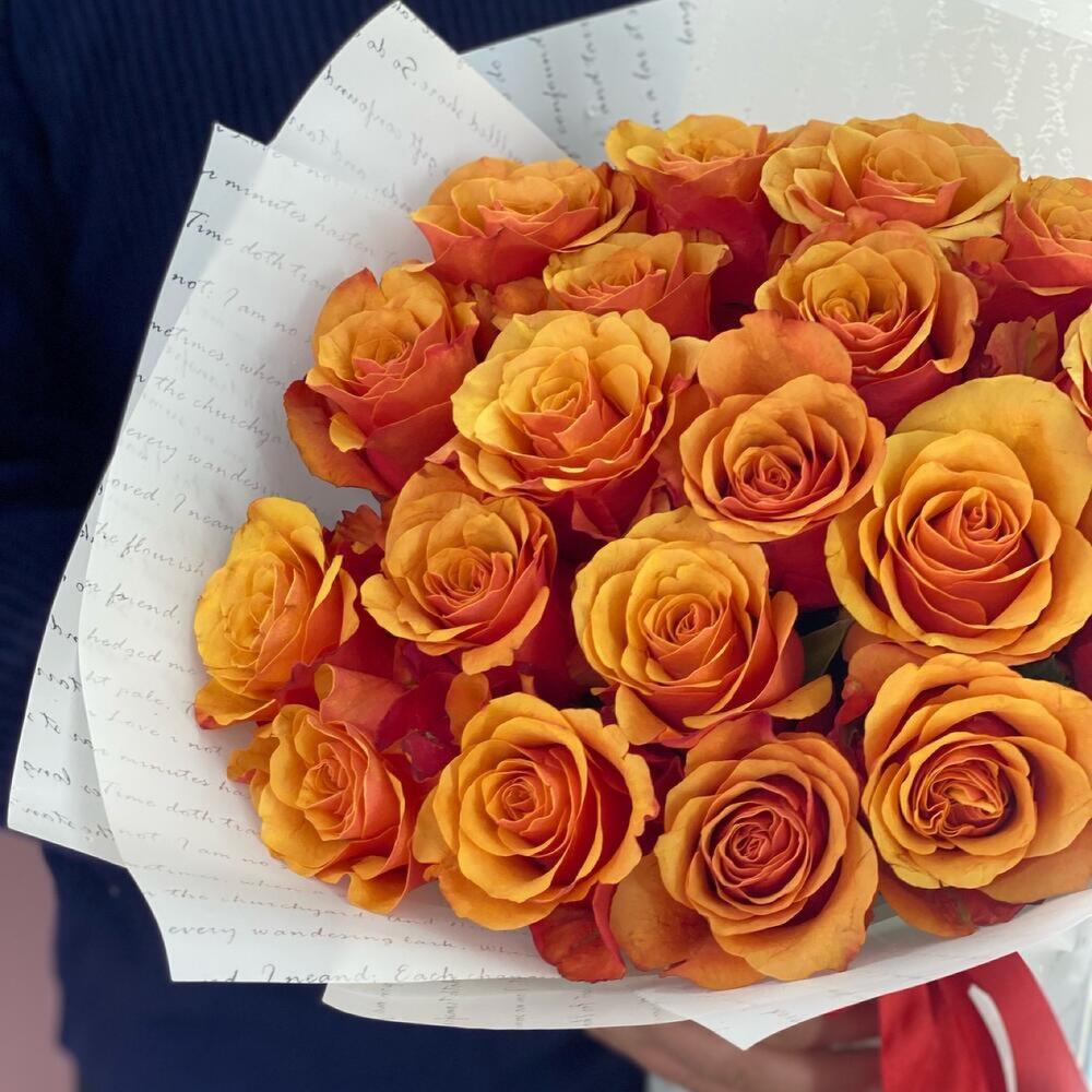 Оранжевая роза – 19 шт. Открыточка с вашими пожеланиями – 1 шт. Упаковка дизайнерская – 1 шт.