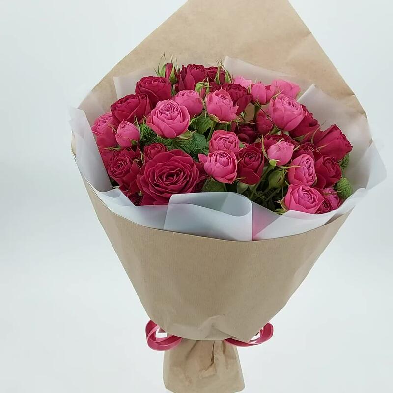 Лента атласная – 2 шт.Упаковка пленка матовая – 1 шт.Упаковка крафт – 1 шт.роза кустовая премиум – 9 шт.
