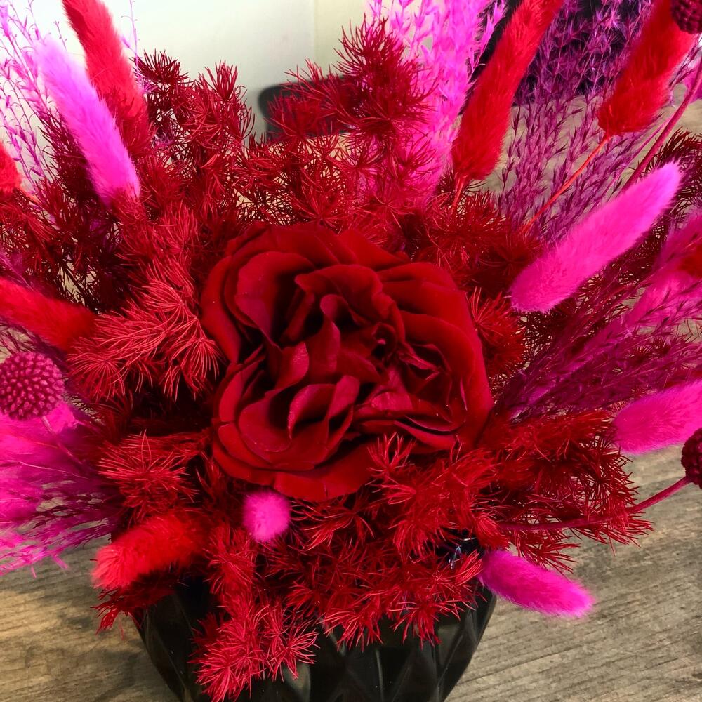 Насыщенная бордовая композиция из сухоцветов и стабилизированной розы в контрастном кашпо.Долговечная композиция.
