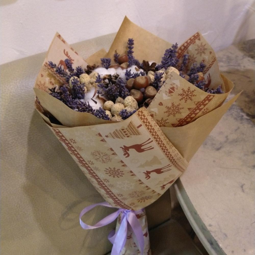 Хлопок натуральный – 5 шт.Шишки натуральные – 7 шт.орехи фундук вертушка – 3 шт.орех лесной в кожуре – 3 шт.Лаванда пучок – 1 шт.Крафт упаковка – 1 шт.Пленка прозрачная – 1 шт.Лента атласная – 1 шт.