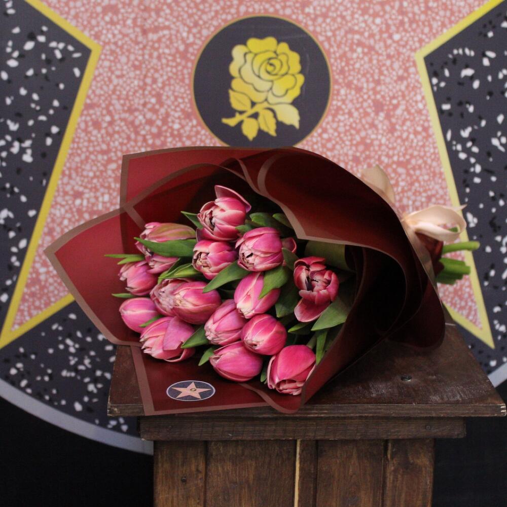 тюльпан пионовидный коламбус – 15 шт.Пленка дизайнерская – 2 шт.Лента атласная – 1 шт.