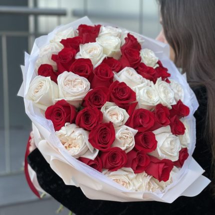 Шикарный букет мраморной кустовой розы 51 шт
