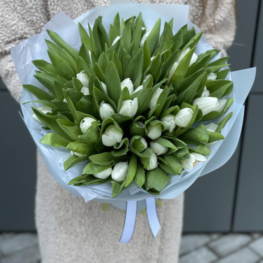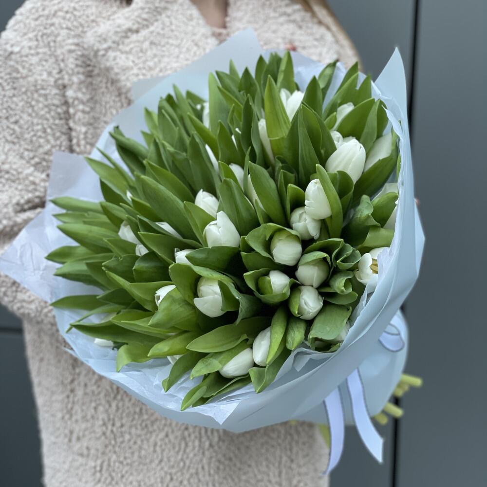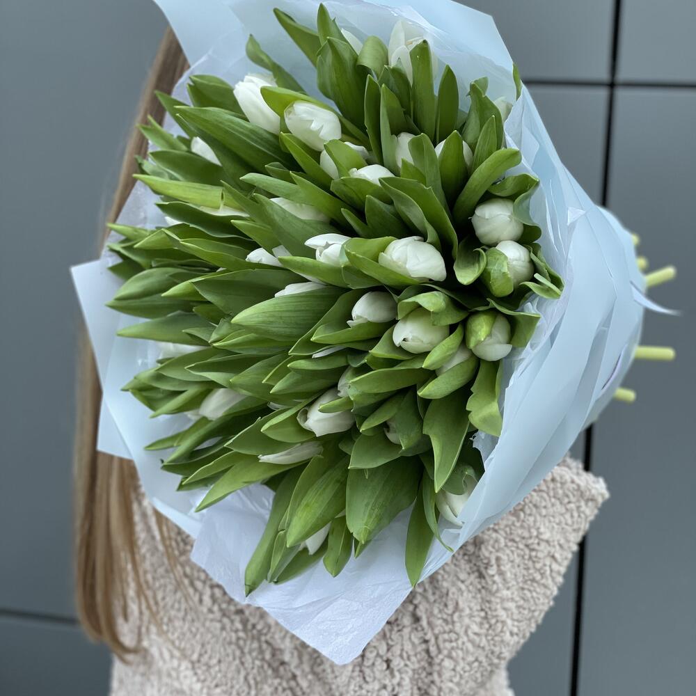 Букет из 51 белоснежного тюльпана сорта Royal Vergin в оформлении!