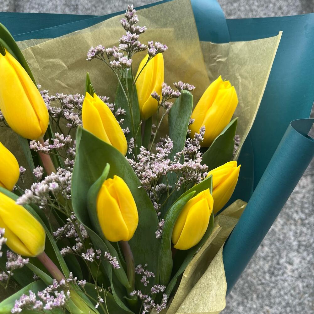 Тюльпан желтый – 9 шт.Лимониум – 1 шт.тишью золотое – 1 шт.Упаковка корейская пленка – 1 шт.Лента атласная – 1 шт.