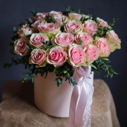 25 розовых роз в белой коробке